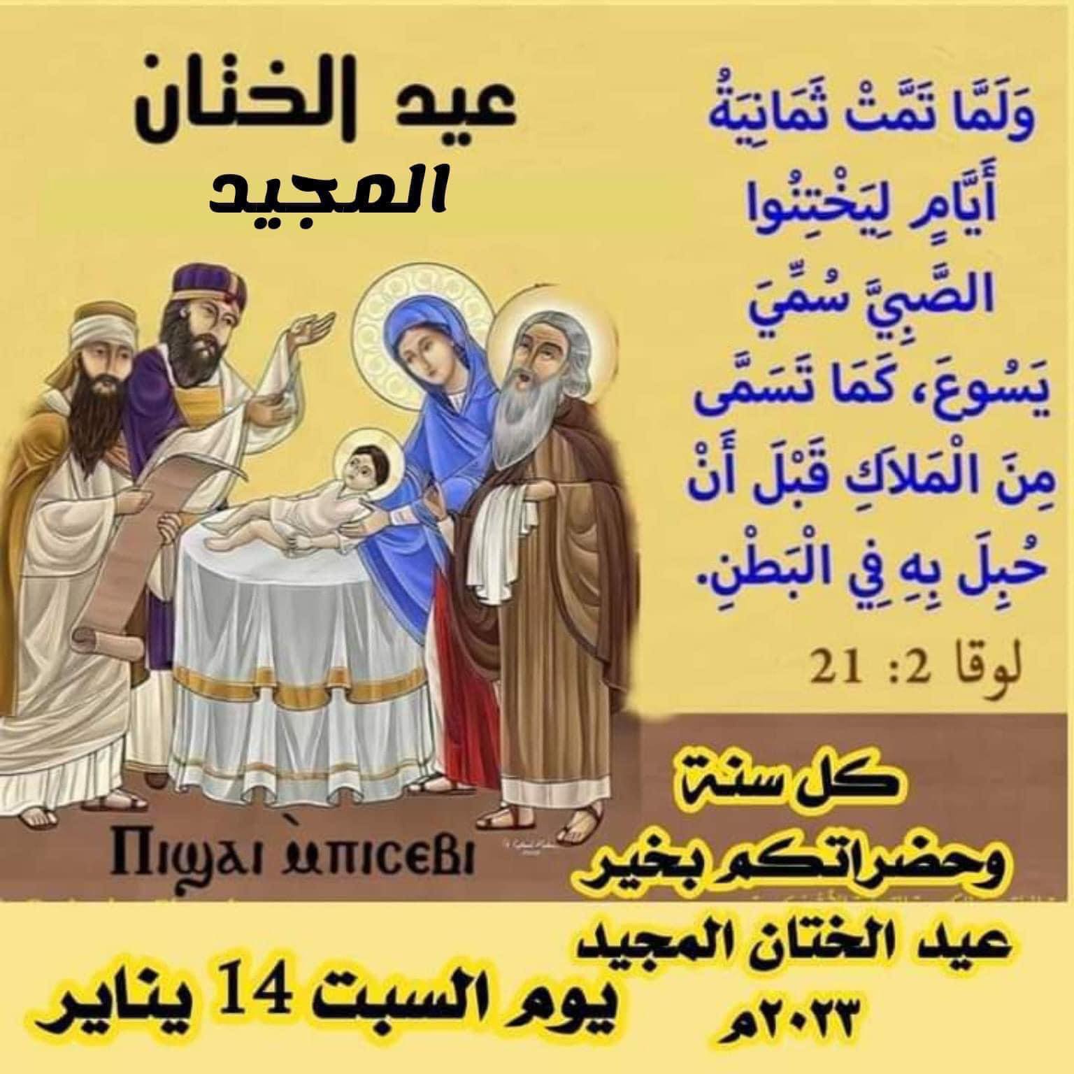 عيد ختان السيد المسيح له المجد، في اليوم الثامن من ميلاده حسب الناموس اليهودي، لكي يُكمل الوصية، كما يقول معلمنا القديس بولس الرسول: ” وأقول أن #يسوع_المسيح قد صار خادم الختان من أجل صدق الله حتى يثبت مواعيد الآباء ” ( رومية 15: ??. ثم أعطانا علامة العهد الجديد بالمعمودية كما قال معلمنا القديس بولس الرسول ” وبه أيضاً خُتنتم ختاناً غير مصنوع بيد، بخلع جسم خطايا البشرية، بختان المسيح، مدفونين معه في المعمودية، التي فيها أقمتم أيضاً معه بإيمان عمل الله الذي أقامه من الأموات. وإذ كنتم أمواتاً في الخطايا، وغلف جسدكم أحياكم معه مسامحاً لكم بجميع الخطايا” ( كولوسى 2: 11- 13). أي أننا في عهد النعمة نحفظ الختان الروحي القلبي بالتوبة عن الخطايا لنحيا للرب في البر والقداسة.وعيد الختان هو أحد الأعياد السيدية السبعة الصغرى التي تُعيِّد فيها الكنيسة للسيد المسيح له المجد إلى الأبد. آمين