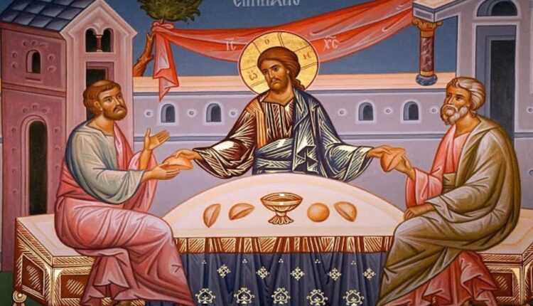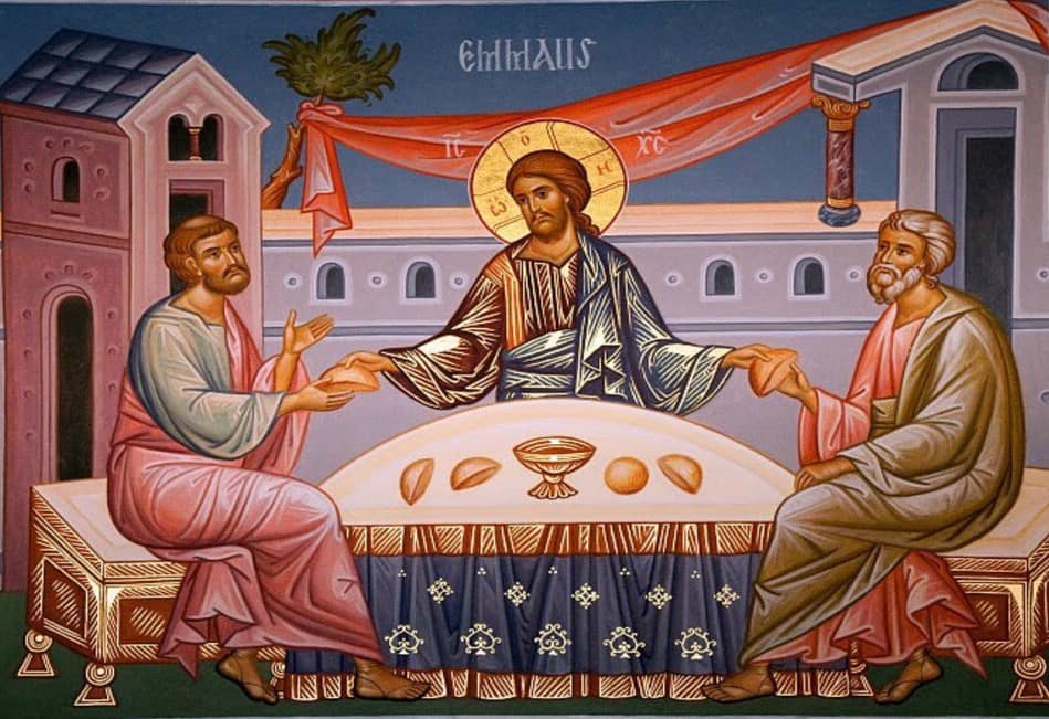 وإذا اثنانِ مِنهُمْ كانا مُنطَلِقَينِ في ذلكَ اليومِ إلَى قريةٍ بَعيدَةٍ عن أورُشَليمَ سِتّينَ غَلوَةً، اسمُها «عِمواسُ». وكانا يتَكلَّمانِ بَعضُهُما مع بَعضٍ عن جميعِ هذِهِ الحَوادِثِ. وفيما هُما يتَكلَّمانِ ويَتَحاوَرانِ، اقتَرَبَ إليهِما يَسوعُ نَفسُهُ وكانَ يَمشي معهُما. ولكن أُمسِكَتْ أعيُنُهُما عن مَعرِفَتِهِ. فقالَ لهُما: «ما هذا الكلامُ الّذي تتَطارَحانِ بهِ وأنتُما ماشيانِ عابِسَينِ؟». فأجابَ أحَدُهُما، الّذي اسمُهُ كِليوباسُ وقالَ لهُ: «هل أنتَ مُتَغَرِّبٌ وحدَكَ في أورُشَليمَ ولَمْ تعلَمِ الأُمورَ الّتي حَدَثَتْ فيها في هذِهِ الأيّامِ؟». فقالَ لهُما: «وما هي؟». فقالا: «المُختَصَّةُ بيَسوعَ النّاصِريِّ، الّذي كانَ إنسانًا نَبيًّا مُقتَدِرًا في الفِعلِ والقَوْلِ أمامَ اللهِ وجميعِ الشَّعبِ. كيفَ أسلَمَهُ رؤَساءُ الكهنةِ وحُكّامُنا لقَضاءِ الموتِ وصَلَبوهُ. ونَحنُ كُنّا نَرجو أنَّهُ هو المُزمِعُ أنْ يَفديَ إسرائيلَ. ولكن، مع هذا كُلِّهِ، اليومَ لهُ ثَلاثَةُ أيّامٍ منذُ حَدَثَ ذلكَ. بل بَعضُ النِّساءِ مِنّا حَيَّرنَنا إذ كُنَّ باكِرًا عِندَ القَبرِ، ولَمّا لَمْ يَجِدنَ جَسَدَهُ أتَينَ قائلاتٍ: إنَّهُنَّ رأينَ مَنظَرَ مَلائكَةٍ قالوا إنَّهُ حَيٌّ. ومَضَى قَوْمٌ مِنَ الّذينَ معنا إلَى القَبرِ، فوَجَدوا هكذا كما قالَتْ أيضًا النِّساءُ، وأمّا هو فلَمْ يَرَوْهُ». فقالَ لهُما: «أيُّها الغَبيّانِ والبَطيئا القُلوبِ في الإيمانِ بجميعِ ما تكلَّمَ بهِ الأنبياءُ! أما كانَ يَنبَغي أنَّ المَسيحَ يتألَّمُ بهذا ويَدخُلُ إلَى مَجدِهِ؟». ثُمَّ ابتَدأَ مِنْ موسَى ومِنْ جميعِ الأنبياءِ يُفَسِّرُ لهُما الأُمورَ المُختَصَّةَ بهِ في جميعِ الكُتُبِ. ثُمَّ اقتَرَبوا إلَى القريةِ الّتي كانا مُنطَلِقَينِ إليها، وهو تظاهَرَ كأنَّهُ مُنطَلِقٌ إلَى مَكانٍ أبعَدَ. فألزَماهُ قائلَينِ: «امكُثْ معنا، لأنَّهُ نَحوُ المساءِ وقَدْ مالَ النَّهارُ». فدَخَلَ ليَمكُثَ معهُما. فلَمّا اتَّكأَ معهُما، أخَذَ خُبزًا وبارَكَ وكسَّرَ وناوَلهُما، فانفَتَحَتْ أعيُنُهُما وعَرَفاهُ ثُمَّ اختَفَى عنهُما، فقالَ بَعضُهُما لبَعضٍ: «ألَمْ يَكُنْ قَلبُنا مُلتَهِبًا فينا إذ كانَ يُكلِّمُنا في الطريقِ ويوضِحُ لنا الكُتُبَ؟». فقاما في تِلكَ السّاعَةِ ورَجَعا إلَى أورُشَليمَ، ووجَدا الأحَدَ عشَرَ مُجتَمِعينَ، هُم والّذينَ معهُم وهُم يقولونَ: «إنَّ الرَّبَّ قامَ بالحَقيقَةِ وظَهَرَ لسِمعانَ!». وأمّا هُما فكانا يُخبِرانِ بما حَدَثَ في الطريقِ، وكيفَ عَرَفاهُ عِندَ كسرِ الخُبزِ.”